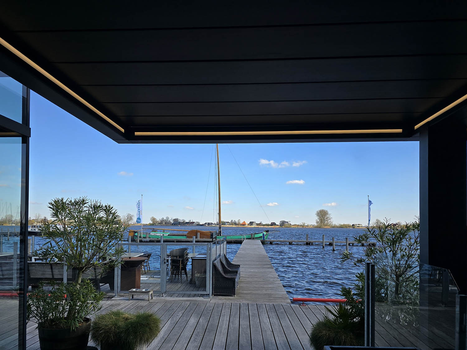 Geniet van open lucht of schaduw met één druk op de knop. De brede lamellen kantelen soepel voor zonlicht of sluiten naadloos voor bescherming tegen regen. Met geïntegreerde LED-verlichting creëert u direct sfeer, dag én nacht — comfort en design in één strak geheel.