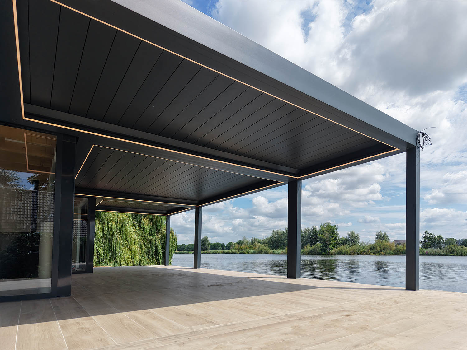 De sfeer onder de Imago is uniek, zeker wanneer de optionele, in de lamellen geïntegreerde verlichting een zachte gloed verspreidt. Het voelt als een high-end, openlucht lounge. Dit model is ontworpen voor de purist, de liefhebber van minimalisme voor wie elk detail telt. Het is de ultieme beloning, een plek waar design en comfort in perfecte harmonie samenkomen.
