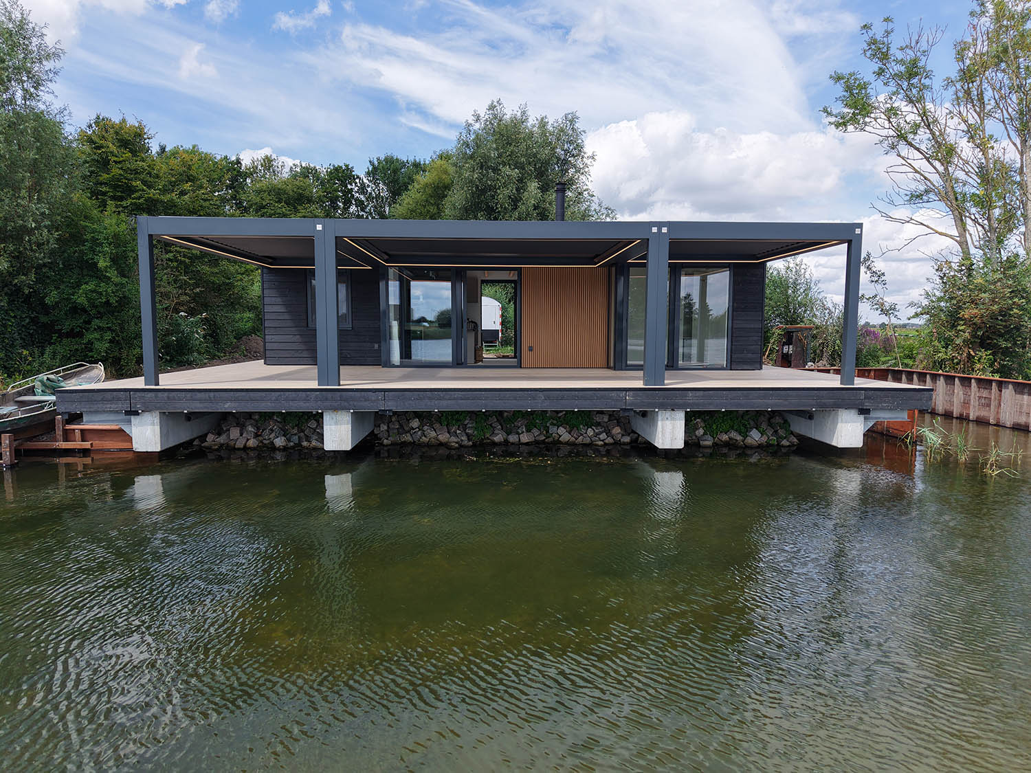 - Geen zichtbare goten of regenpijpen – alle afvoeren verwerkt in de staanders voor een strak design.