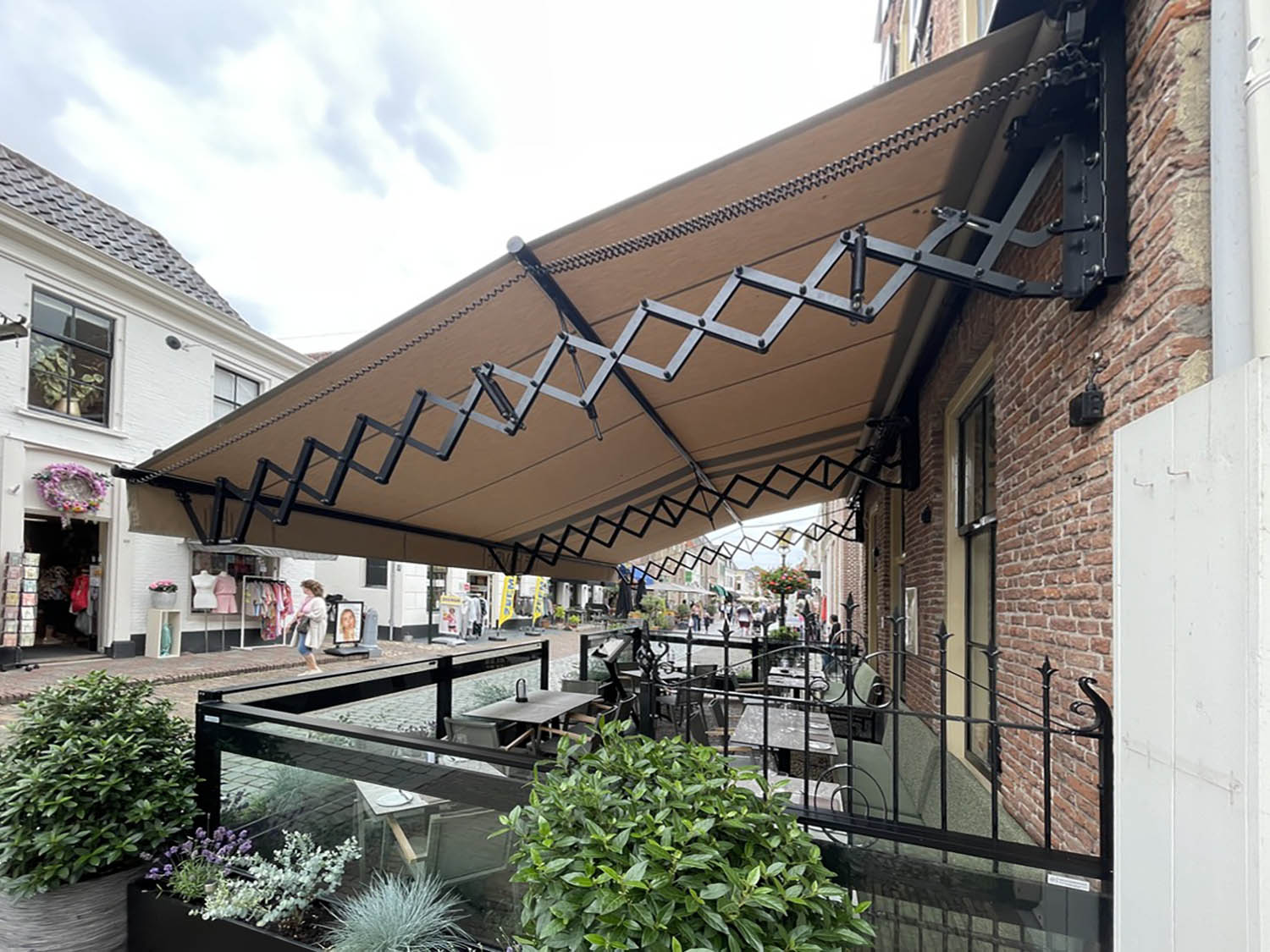 Niet op elk terras mag je een vaste overkapping plaatsen. Denk aan vergunningseisen, monumentale gevels, beperkte ruimte of regels vanuit verhuurder/VvE. In die situaties is een schaararmscherm een slimme oplossing: je creëert schaduw én beschutting, zonder een vaste constructie met staanders. Uitgeklapt heb je een royaal schaduwvlak; ingeklapt blijft de gevel strak en rustig. Het scherm werkt snel en eenvoudig, waardoor je direct kunt reageren op zon of een bui. En dankzij het waterdichte doek zit je ook bij wisselvallig weer comfortabel. Alles wordt op maat gemaakt voor jouw gevel en terras.