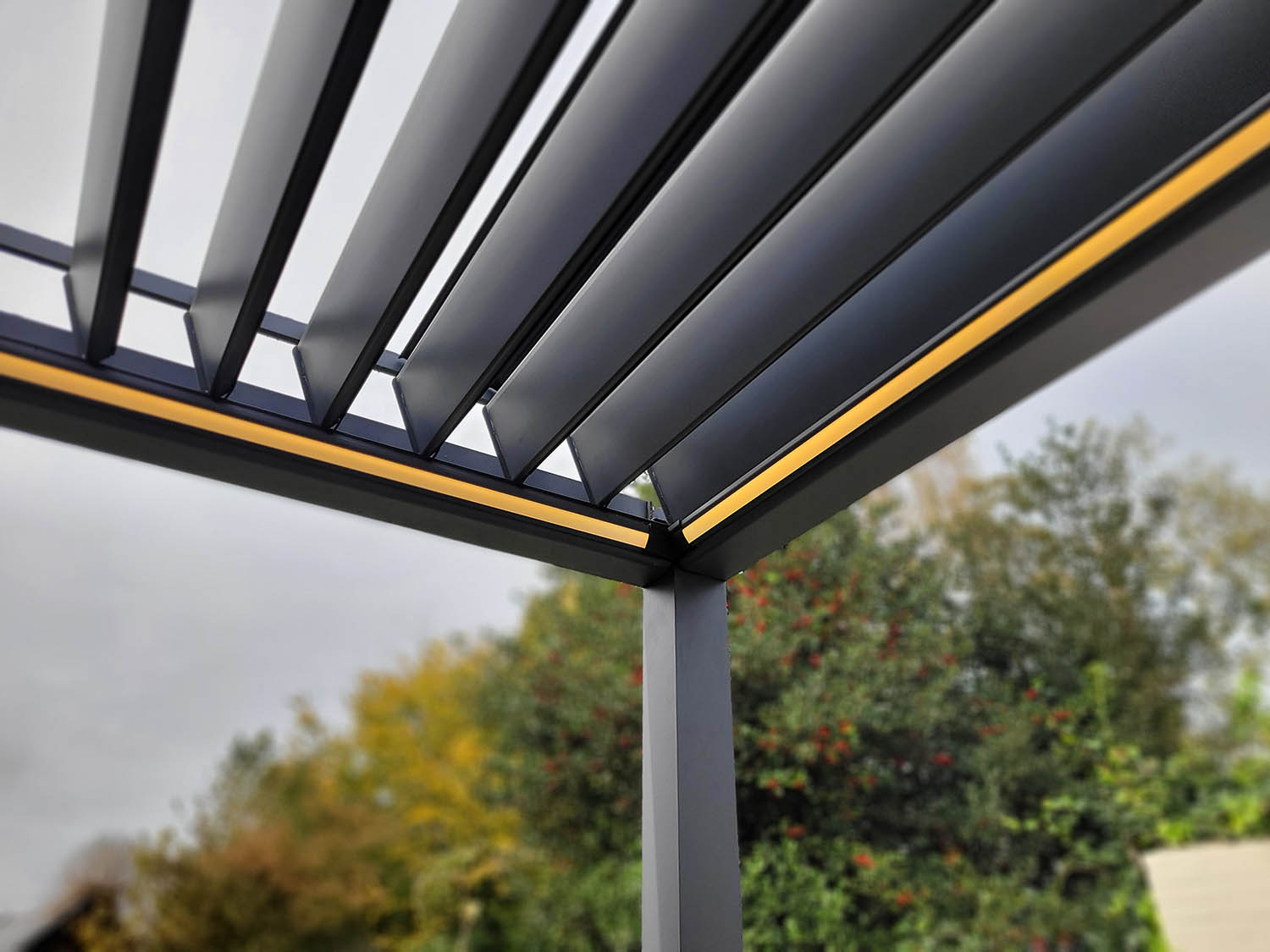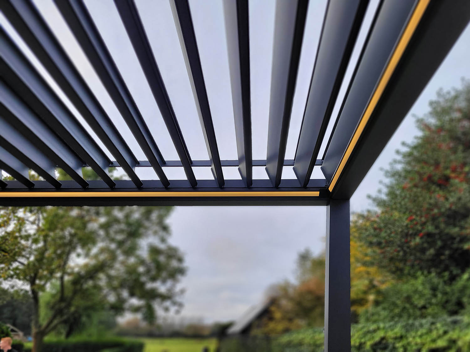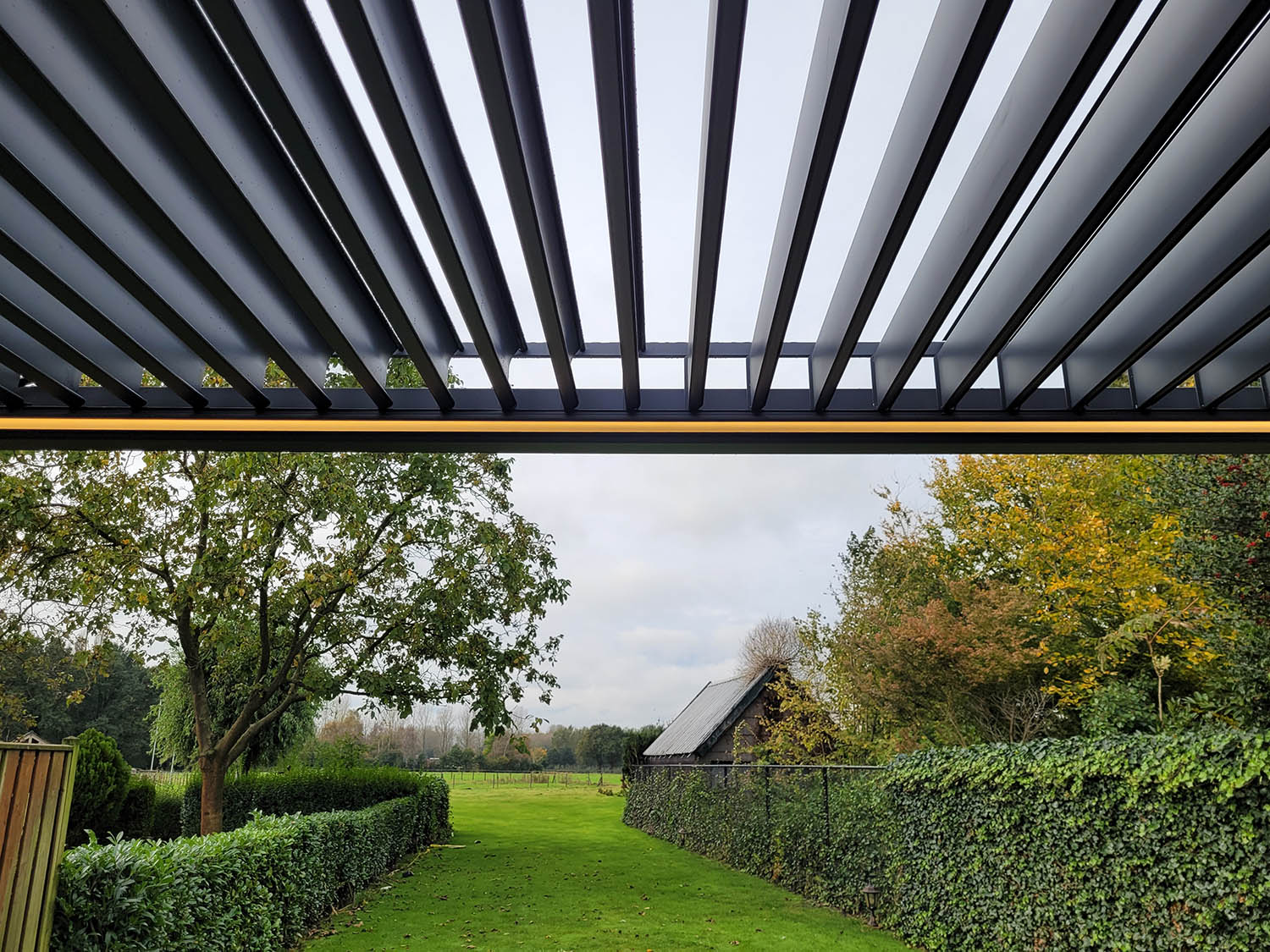Deze overkapping is ontworpen voor maximale functionaliteit. De robuuste staanders vormen een solide basis en de lamellen zijn soepel en stil te bedienen voor de perfecte sfeer. Het systeem is voorbereid op naadloze integratie van opties zoals LED-verlichting of screens.